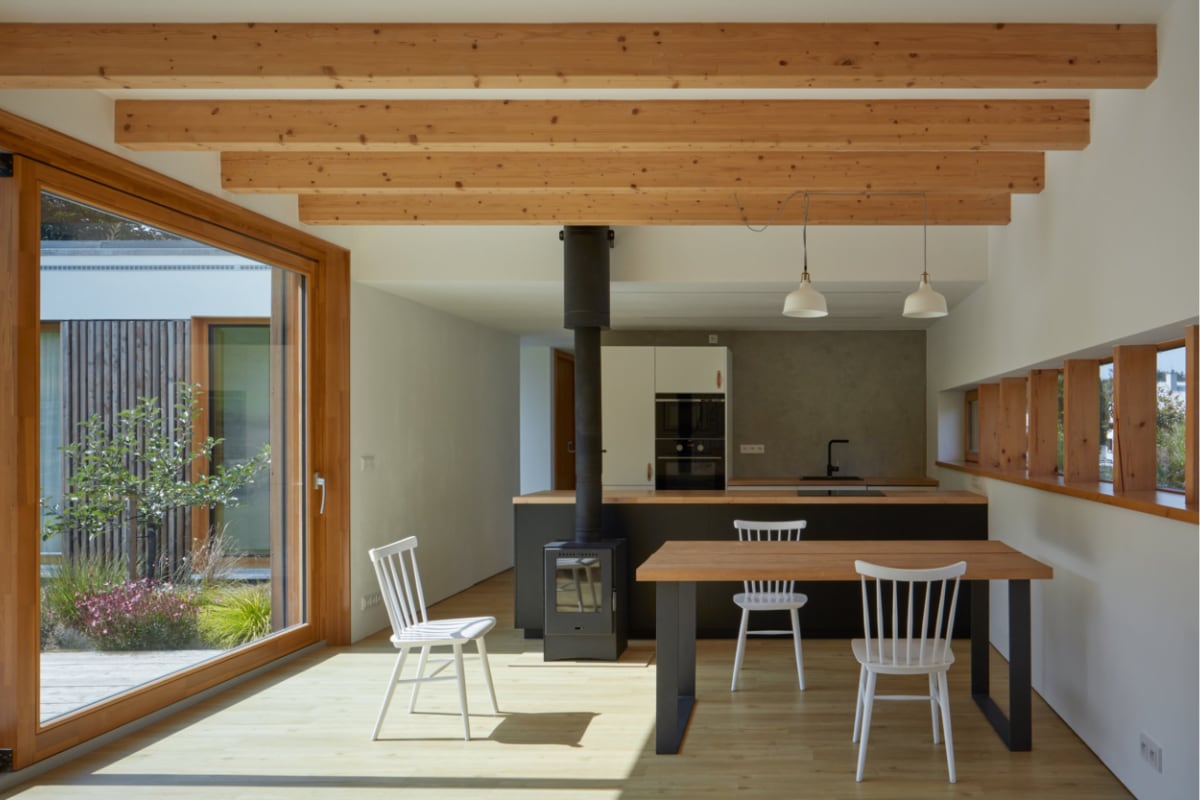 Pro stavbu domu bylo využito velké množství přírodních materiálů, velký podíl dřeva a modifikovaných výrobků ze dřeva. Dřevosatvba je zateplena systémem STEICO, jak ve střešním plášti, tak v podlahách, ale především i na fasádě. Dřevovláknité izolace STEICO byly zvoleny hlavně z důvodu přírodního materiálu a také z důvodu, aby se dům v létě nepřehříval a v zimě nepromrzal.