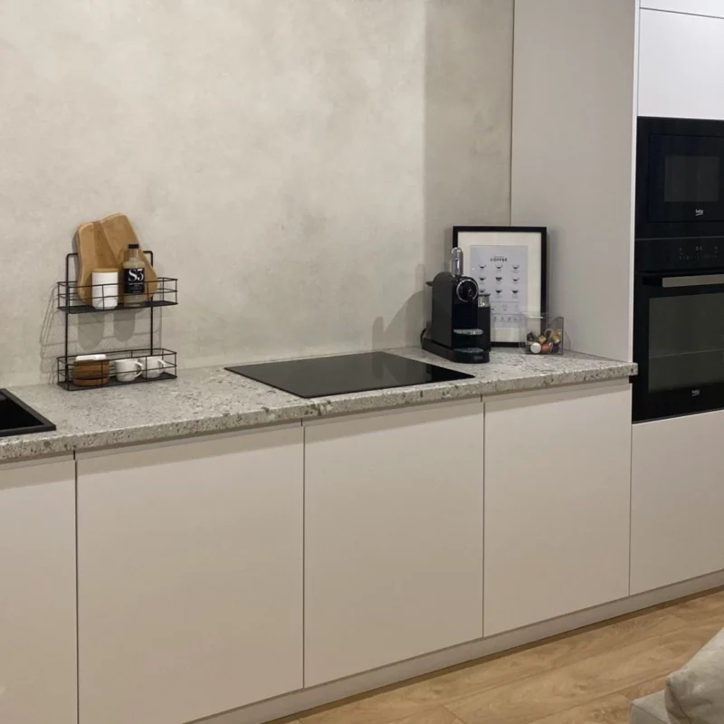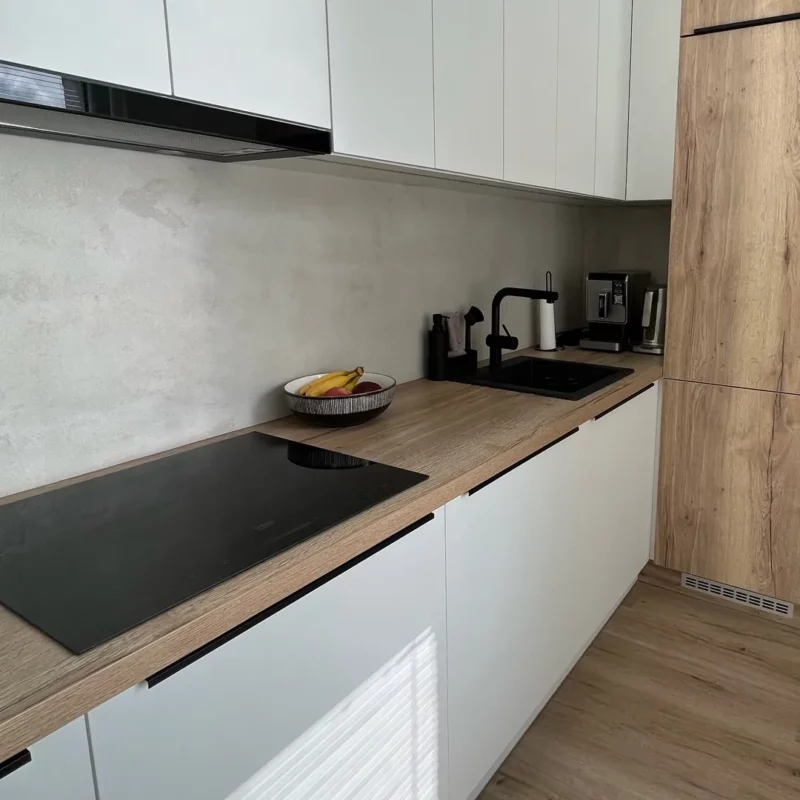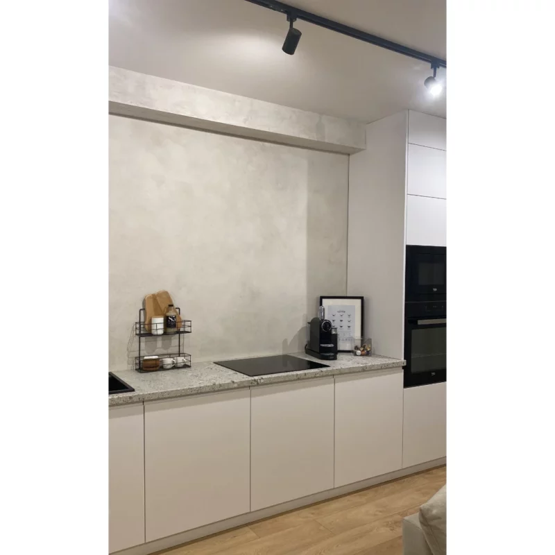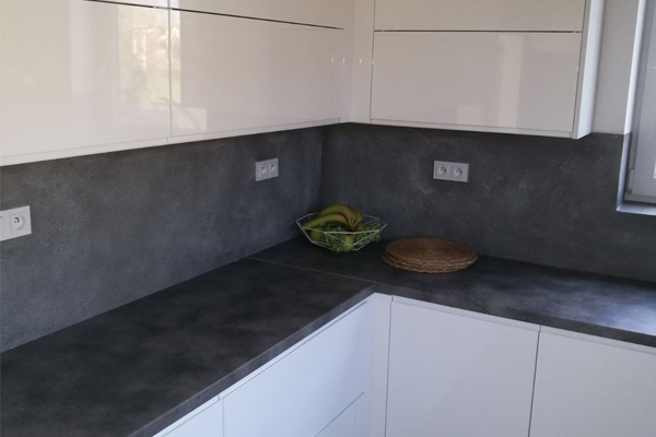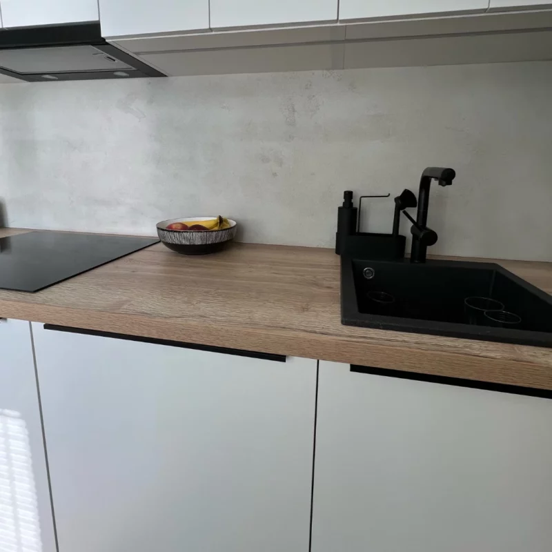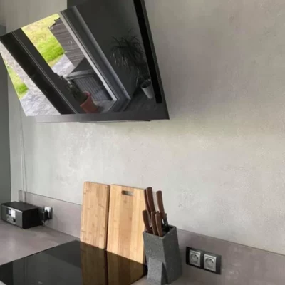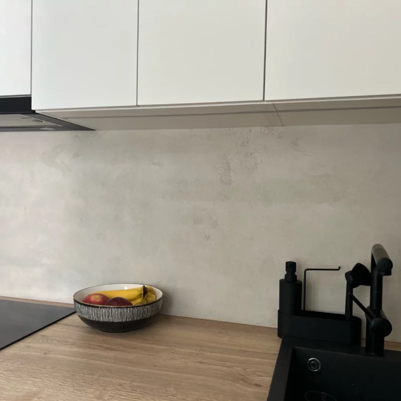 Ano, betonovou stěrku lze bez problémů aplikovat i za kuchyňskou linku.