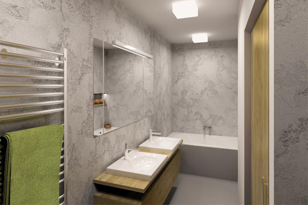 - Betonová stěrka dosahuje vysoké odolnosti proti odstřikující vodě, mýdlům, šamponům a čisticím prostředkům.