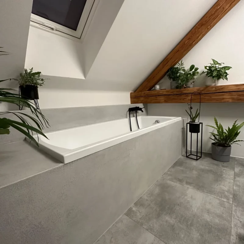Ano, betonovou stěrku lze bez problémů aplikovat i za vanu. Díky finálnímu ochrannému voděodolnému laku je povrch odolný vůči vlhkosti i stříkající vodě. Důležitá je ale správná aplikace všech vrstev a zatmelení přechodů mezi vanou a stěrkou (např. protiplísňovým silikonem, nebo pur tmelem, který má delší životnost).