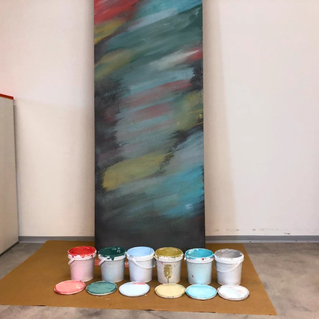 3. Aplikace stěrky na plátno Pomocí špachtle nebo malířského nože naneste stěrku na plátno. Buďte kreativní – můžete vytvářet různé textury, vrstvy a vzory. Nechte stěrku zaschnout alespoň 12 hodin, ideálně do druhého dne.