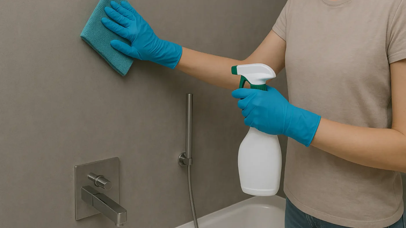Jednou z velkých předností betonové stěrky do interiéru je nenáročná údržba povrchu. Stěrka vytváří soudržnou, nenasákavou vrstvu, kterou běžně vyčistíte pouhým setřením vlhkým hadrem nebo mopem. Oproti například spárovaným obkladům odpadá drhnutí spár – povrch je hladký a všechen prach či běžné nečistoty lze snadno setřít. Voda stěrce nevadí, díky ochrannému pur laku je povrch voděodolný, takže se často používá i v koupelnách, sprchových koutech či kuchyních. Běžné skvrny od vody, mýdla či jídla stačí omýt teplou vodou, případně s kapkou jemného saponátu či odmašťovače. Dokonce je možné krátkodobě použít i dezinfekční prostředky (například v koupelně nebo na toaletě) – jen je nenechte na povrchu zaschnout a vždy je opláchněte čistou vodou. Jakmile se Vám objeví v koupelně plíseň, tak je problém s vlhkostí – špatné odsávání vlhkosti, nedostatečné větrání. Ve spoustě koupelen chybí ve dveřích otvory pro nasávání vzduchu – když zapnete ventilátor, tak potřebuje vzduch nasávát, vytvořit podtlak a vlhký vzduch transportovat pryč.