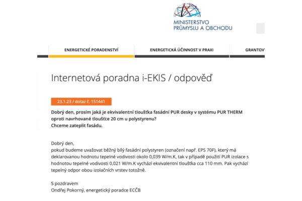 EKIS a doporučení tloušťky 110 mm PUR desky, jako ekvivalent k bílému polystyrenu, který je v návrhové tloušťce NZU Light