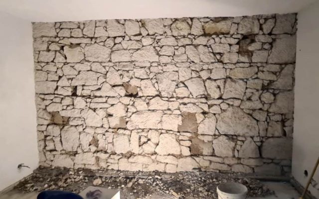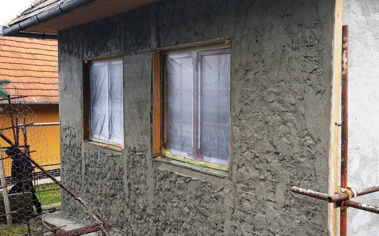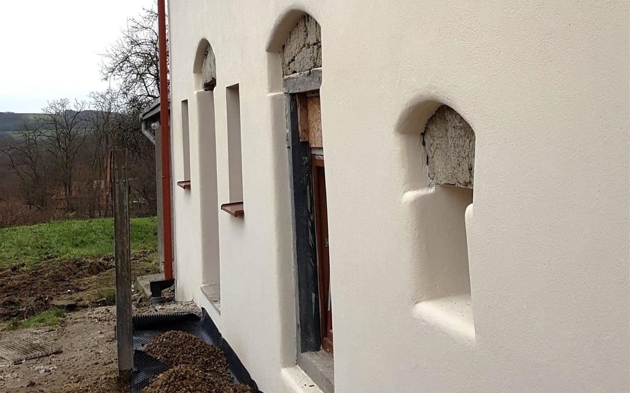 Původní zdivo bylo destruktivně zničeno vlhkostí, vnější omítka odpadávala. Bylo nutné ji odstranit až na kámen, proškrábnout spáry. Nerovnosti byly srovnány jádrovou omítkou. Nebude-li zdivo obsahovat chloridové soli, můžete použít i sanační podhoz a jádrovou sanační omítku. U sanační omítky musíte dát pozor na dostatečně vyschnutí cca 1 mm / 1 den. Jádrová omítka vysychá cca o 30-40% rychleji.
