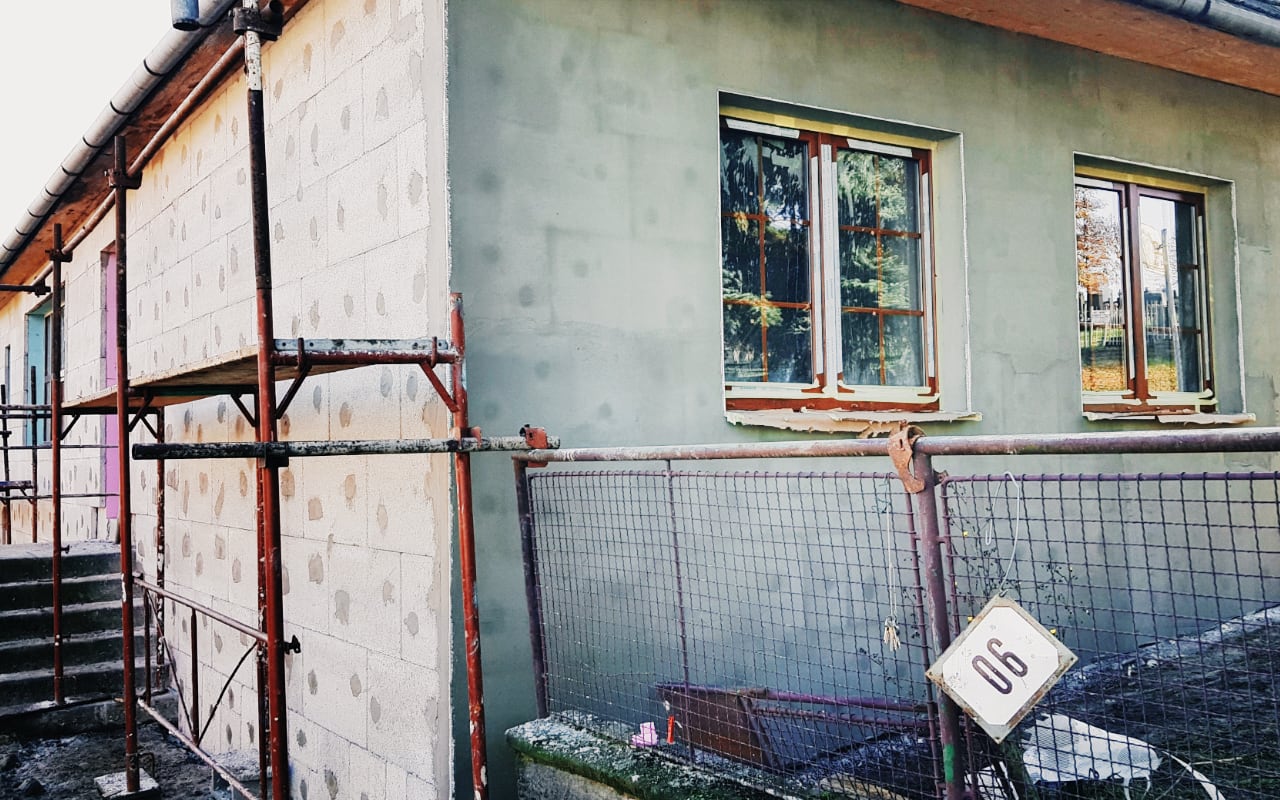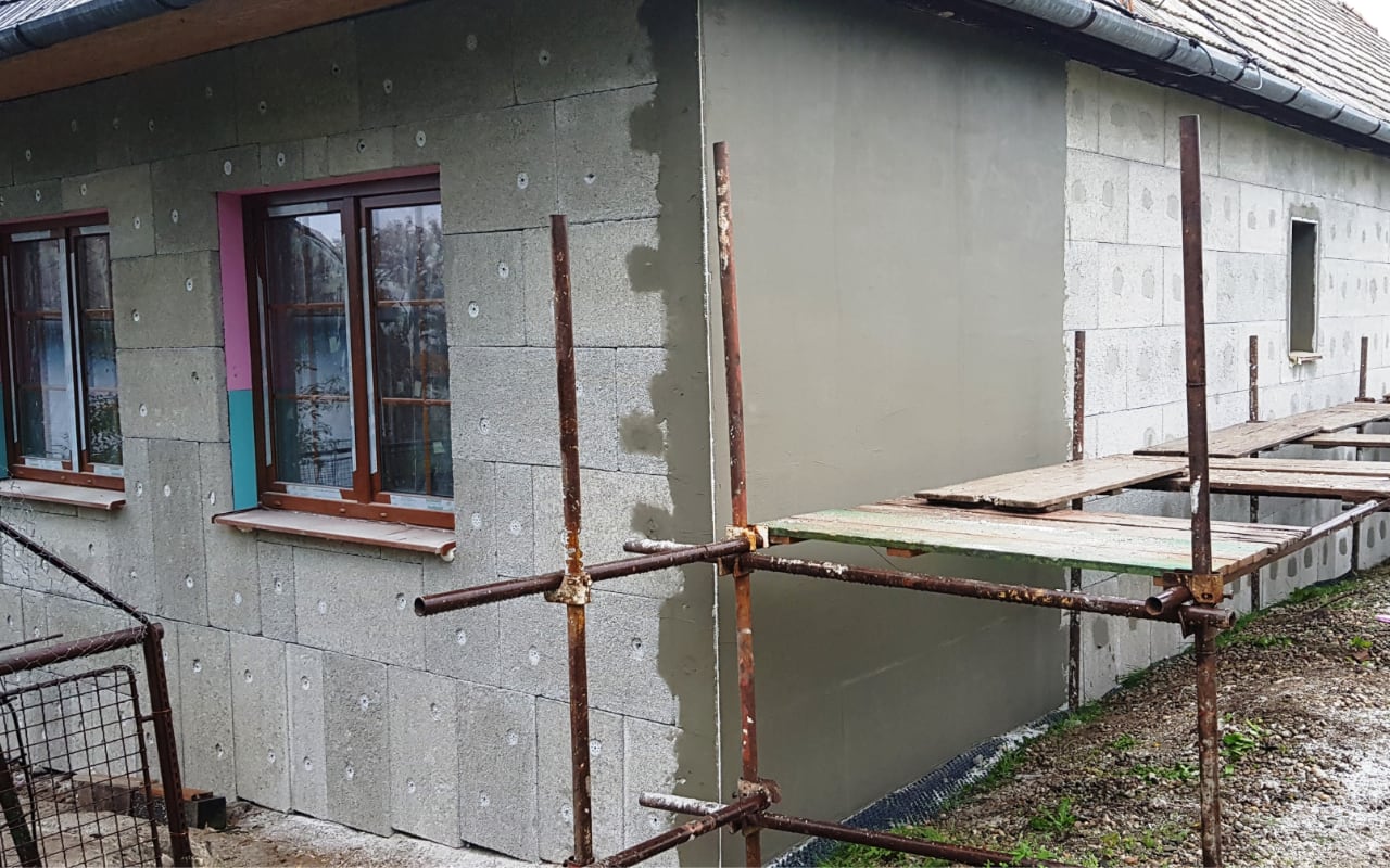 Teprve po vyschnutí podkladu přišlo na řadu zateplení paropropustnými deskami STYRCON. Ten díky své makropórovitosti zůstává suchý i kdyby byl v kontaktu s vlhkým podkladem. Maximální vlhkost podkladu může být 8%, což je hodnocení pro vysokou vlhkost.