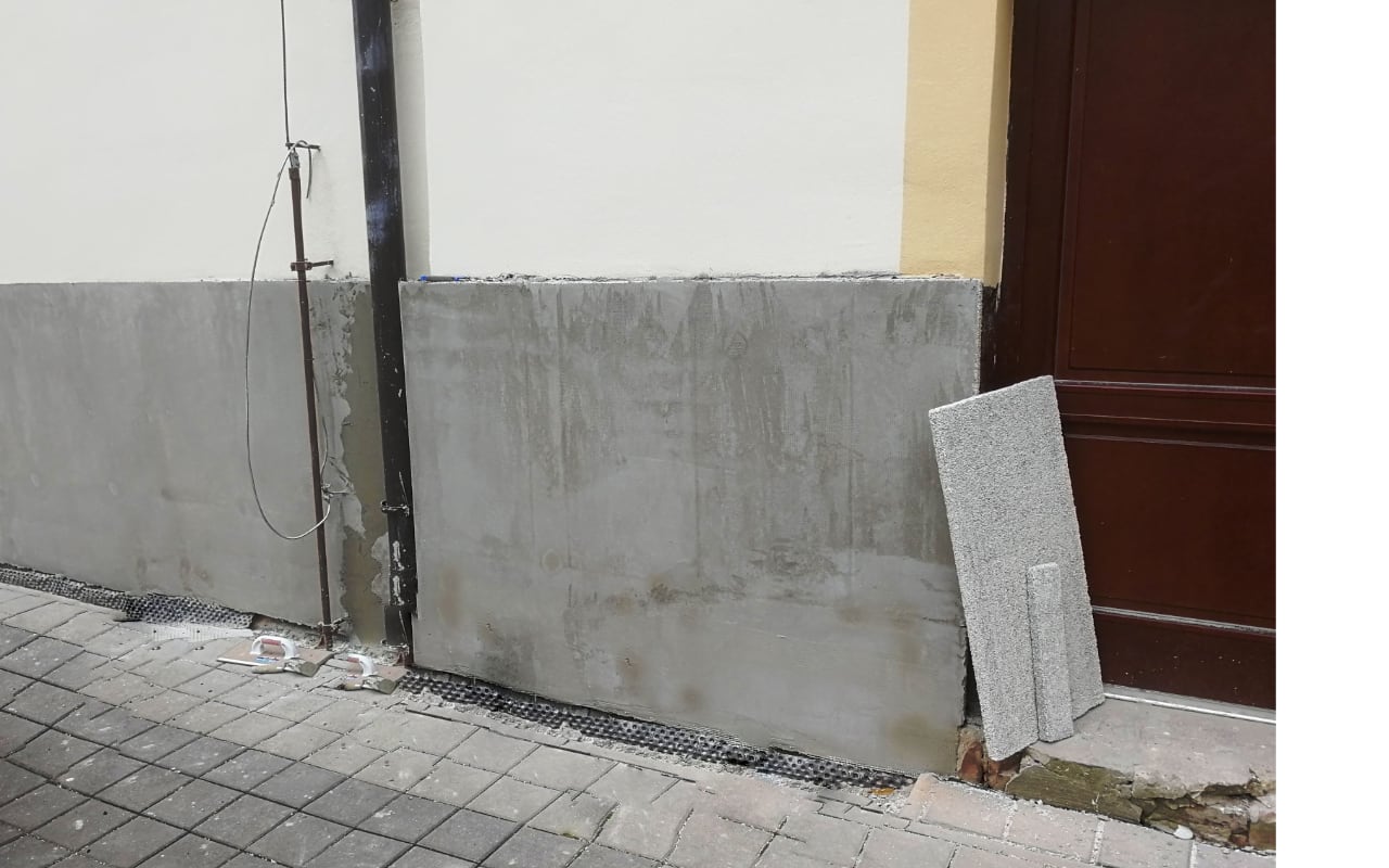 Původní zdivo soklové části potřebuje neustále větrat. Polystyren betonové desky STYRCON byly lepené ke zdivu lepícím tmelem Lepstyr plus tak, aby vznikla vzduchová mezera. Spodní hrana desek byla zapuštěna pod úroveň země. Zabránilo se tím komínovému efektu, „průvanu“ mezi deskami a stěnou.
